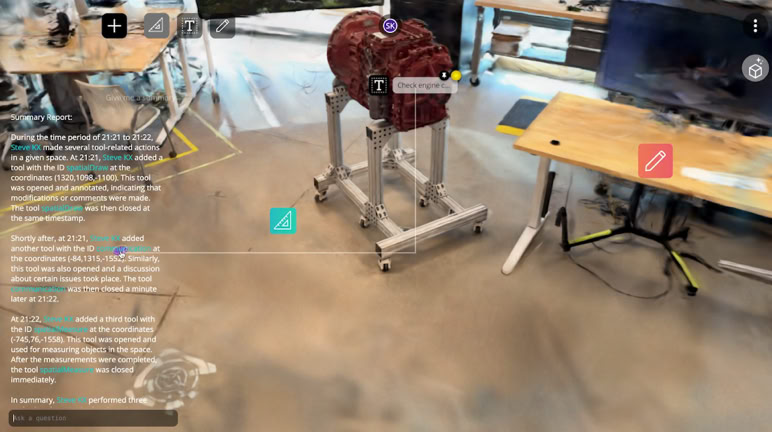 This baseline record serves as the foundation of an intuitive, collaborative workspace accessible via web browser or directly within Microsoft Teams, allowing users to explore and interact with spaces together remotely. Within this environment, multiple specialized spatial applications can be used simultaneously in the multi-tasking interface to tackle real-world problems. For example, the motion analytics application enables you to record and analyze work processes directly within the spatial context, while the measurement application enables you to take accurate virtual measurements about the work process. Additionally, the platform seamlessly integrates IoT and robotic systems, bridging your virtual workspace with the physical world. Our data model coherently organizes every feature of the space from its initial capture to any insights generated by spatial applications. This organization empowers spatial AI systems to understand and interact with these data, supporting more informed and effective decisions.